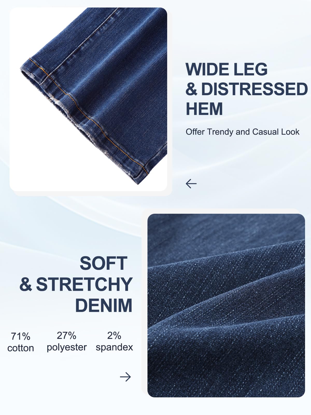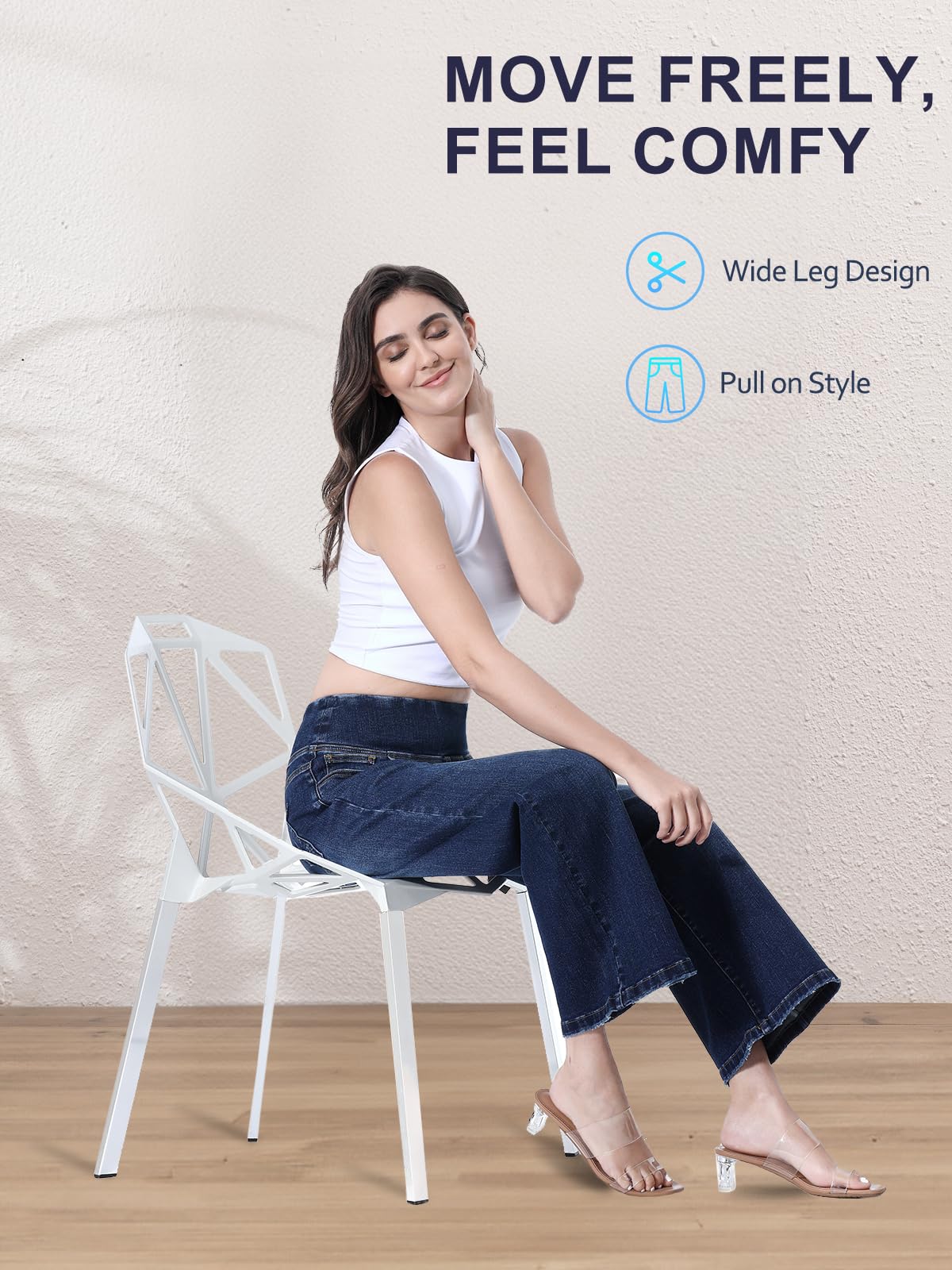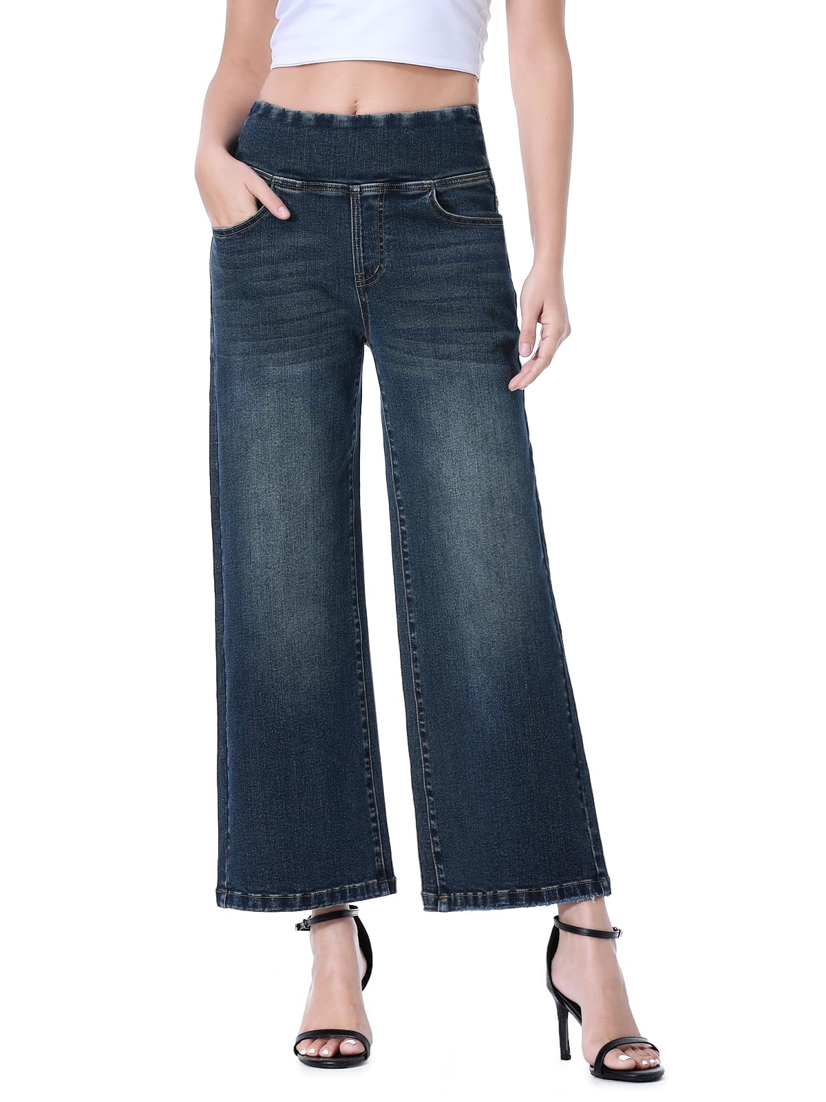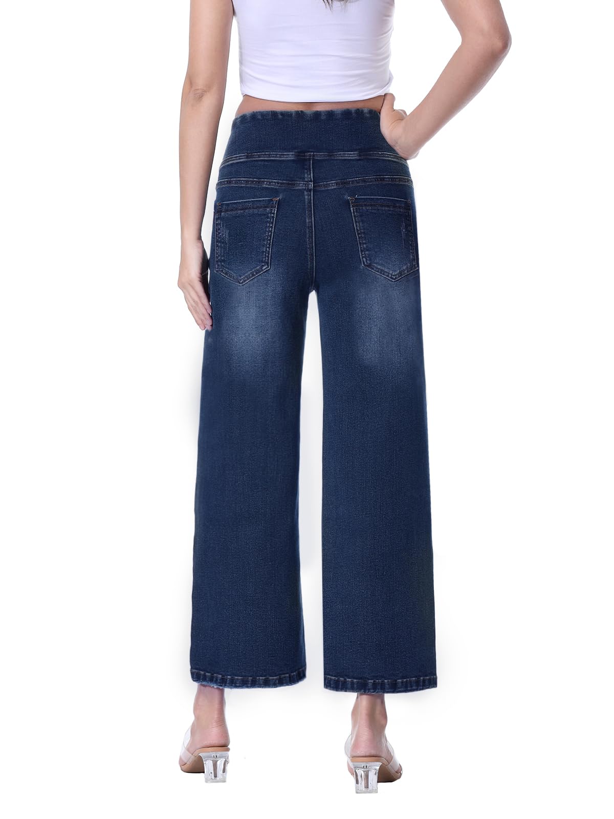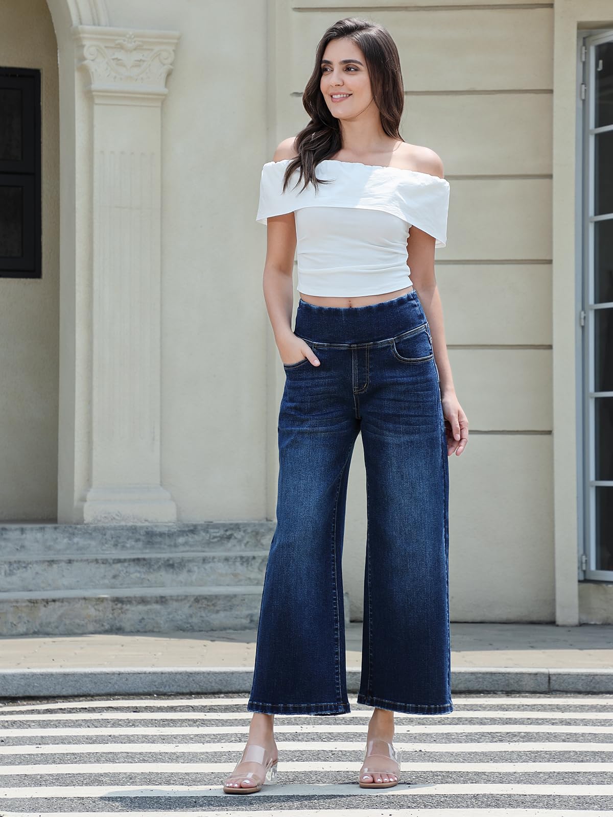 Wide Leg Capri Jeans for Women, Pull on High Waisted Trendy Stretchy Straight Leg Baggy Cropped Tummy Control Jeans
